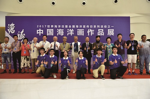 “2017沧海颂·中国海洋画作品展”6月在南京江苏大剧院举行。这是部分参展艺术家、志愿者与领导合影。