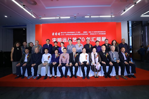 “2019沧海颂·宋明远从艺70年汇报展”5月20日在北京人民美术出版社人美美术馆举行。这是部分领导与嘉宾合影。
