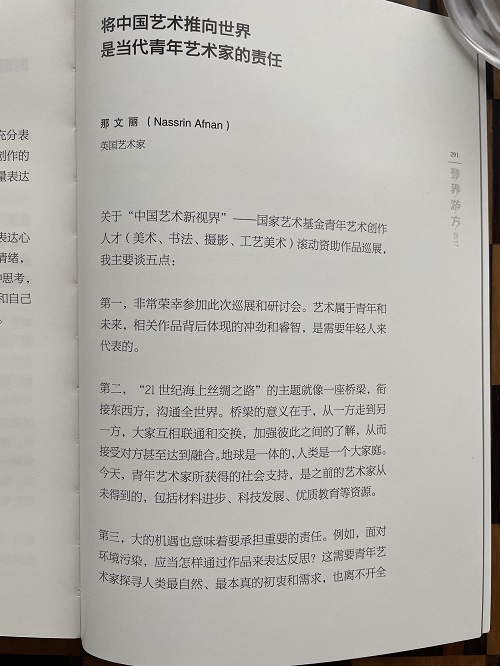 国家艺术基金2017《登界游方》(美术卷)发表那文丽 Nassrin Afnan (英国)文章《将中国艺术推向世界是当代青年艺术家的责任》。