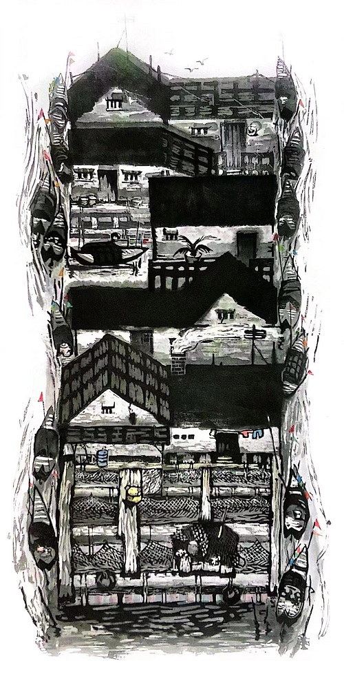 邓子平作品《南海渔家》93×68 cm 2010年作水印版画
