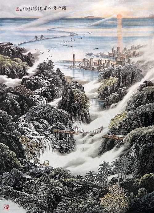 邓子敬主题创作《百年穿越系列组画-开山劈海图》 200×146cm 2021年纸本彩墨